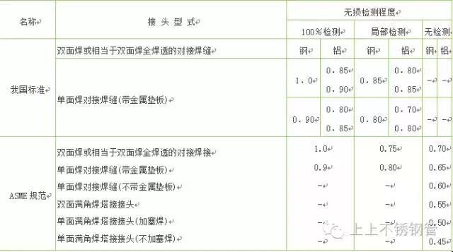 ①表中无损检测,我国对钢制压力容器以射线和超声检测为准,对铝制压力容器以射线检测为准;而ASME规范以射线检测为准,确实无法进行射线检测时允许用超声检测代之。