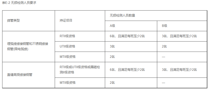 注E-6:从事GA2级长输管道改造、重大修理的压力管道安装单位,其人员、生产场地、安装设备及检验与试验装置除需满足GA2级长输管道安装单位相应要求外,还应具有以下条件: