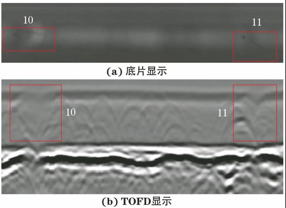 图16 裂纹和夹钨缺陷底片及TOFD显示