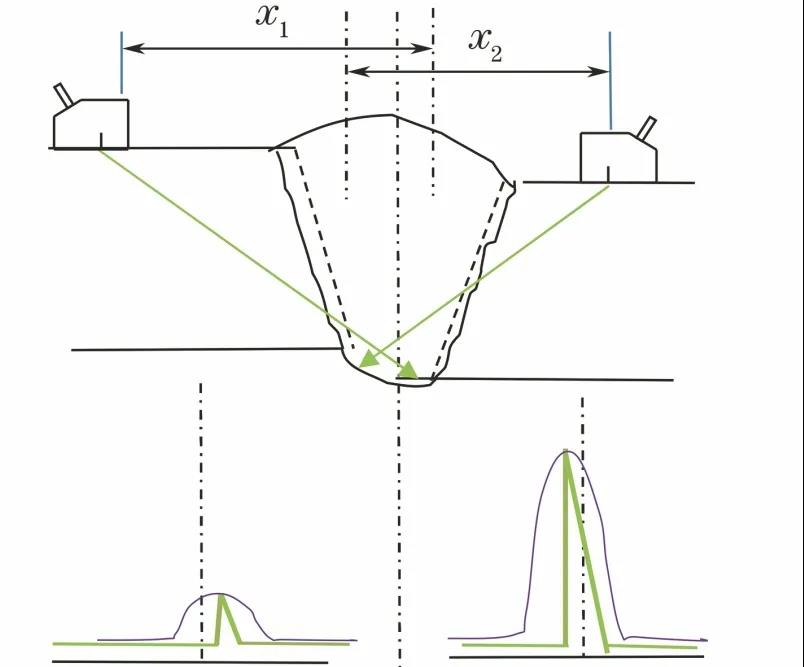 如图1所示,在检测过程中,错边内表面低的一侧根部反射波幅比较高,另一侧反射波幅有明显的不同或没有反射波,水平距离x1和x2的定位点相互交叉,反射波在显示屏出现位置偏向焊缝中心线对侧。另外,反射波的波峰上有小峰,探头左右移动时波幅的高度变化不大。包络波形范围较宽,波形比较单一。