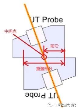 在最高点的位置上,会看到两个楔块此时的重叠部分,通过直尺找到这个重叠部分的中间点,就是声束的出射点,而中间出射点到楔块前端的距离就是前沿。