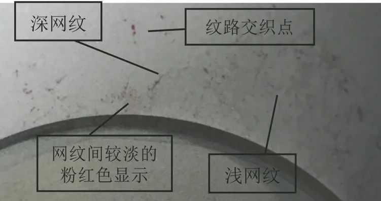 ② 由图8可知,着色渗透检测能发现网纹间明显的粉红色显示,网纹显示较深,一般对该网纹进行磨削处理;