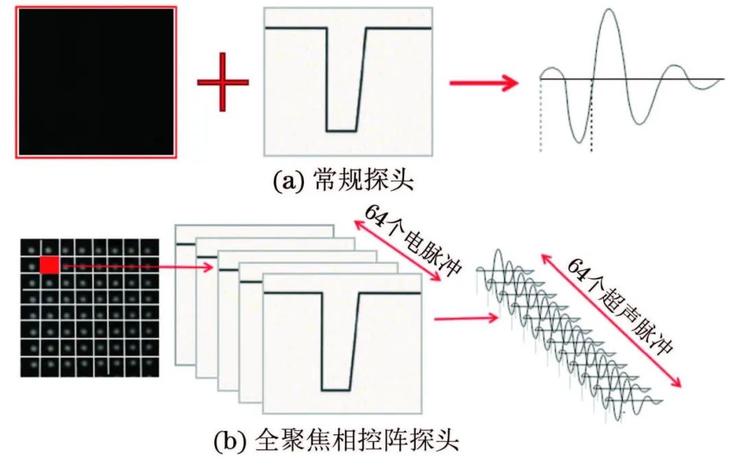 图4 常规探头和全聚焦探头发射阶段的不同原理示意