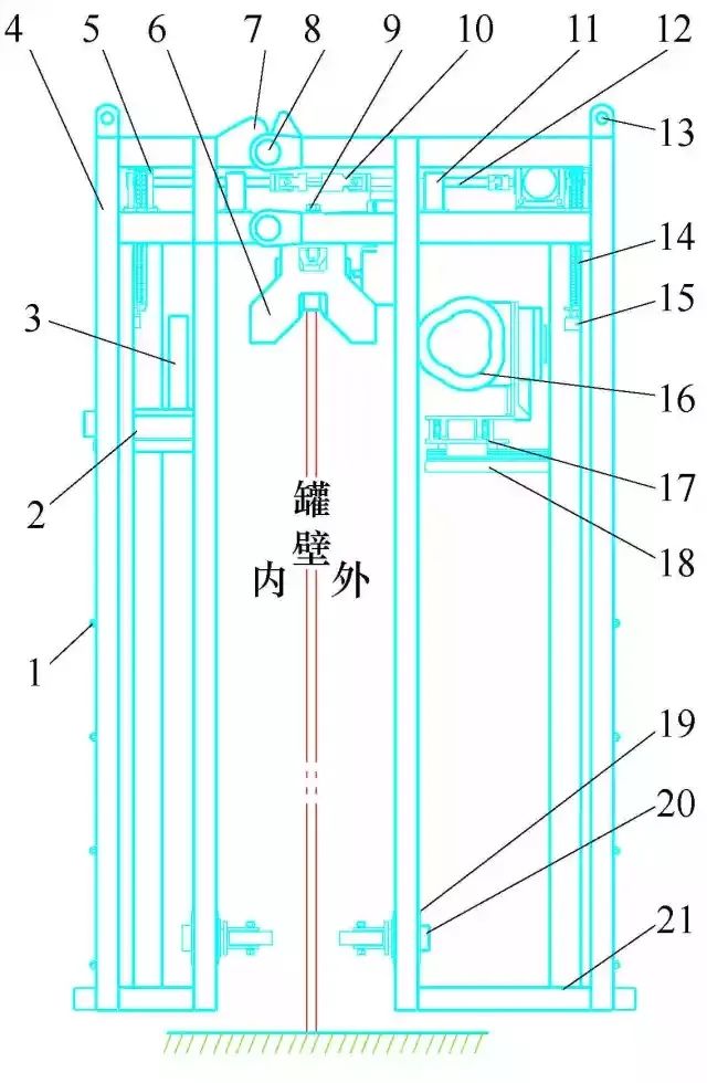 第一,装置沿罐壁板上缘平稳行走。设计门型机架,由内、外机架组成,通过安装在外机架上端的横向运动机构骑坐在罐壁板上缘,机构两侧行走轮之间的角度可调,行走轮表面进行压花处理,保证装置沿罐壁上缘运动平稳,无打滑、憋卡等现象。