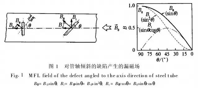 如图1所示,当缺陷延伸方向与磁化方向成角时 ,缺陷处形成的漏磁场B0要比B0(即=0°时的B)小,而B0对漏磁探头的贡献Bl与Bt会更小。