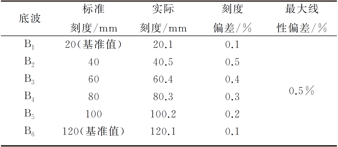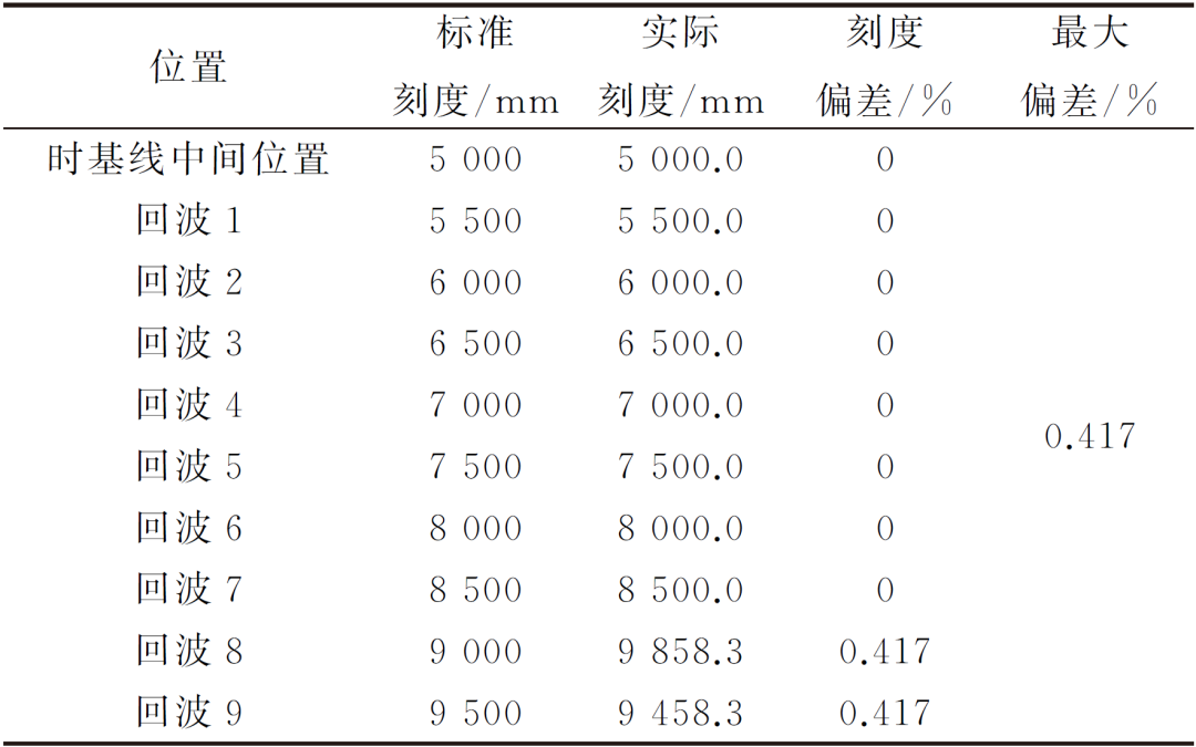 先对探头进行自动调校,输入起始距离为20 mm,终止距离为120 mm,调整时基线,使B1对准全屏宽度的0%、B6对准全屏宽度的100%,依次将回波调至全屏幅度的80%,检查B2~B5这四个回波与标准刻度的偏差(见表5,标准允许的最大线性偏差为全屏宽度的±2%)。