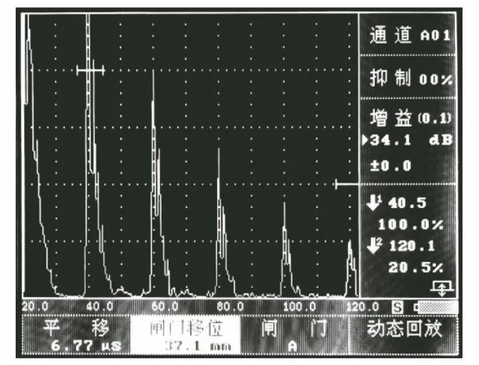 使用的探头型号为2.5P20Z,选用CSK-ⅠA试块,检查20~120 mm范围内的时基线性。调整超声仪,使屏幕上出现B1~B6共6次底波,如图3所示。