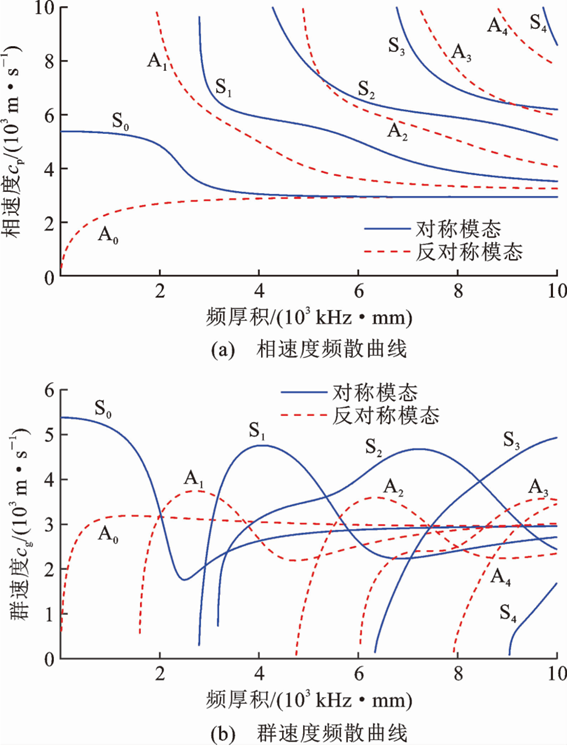 超声导波因结构参数和频率变化导致其相速度改变的现象称为频散,而其频散曲线包含超声导波的多种关键信息,通过对关键信息的分析可对钢桥面板疲劳裂纹进行有限识别。钢桥面板纵肋焊接结构可简化为由多块板组成的板件系统,按照板状结构进行频散特性分析,并进一步研究焊缝特征和交叉过渡等细节对超声导波传播特性的影响。钢材的材料参数按表1取值,以频厚积(频率与板厚的乘积)作为横坐标,计算半无限均匀平板的Lamb波频散曲线如图4所示。