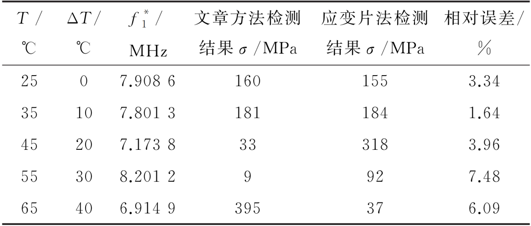 从表2~4可以看出,不同温度下,基于超声回波幅度谱的钢构件绝对应力检测结果与应变片法检测结果的相对误差随控制温度的上升而增大。产生误差的主要原因是高温条件下,超声回波信号出现了衰减,且受到一定程度的干扰。总体而言,通过温度修正后的应力检测公式,可以在8%的误差范围内检测应力,说明该方法具有一定的准确性。