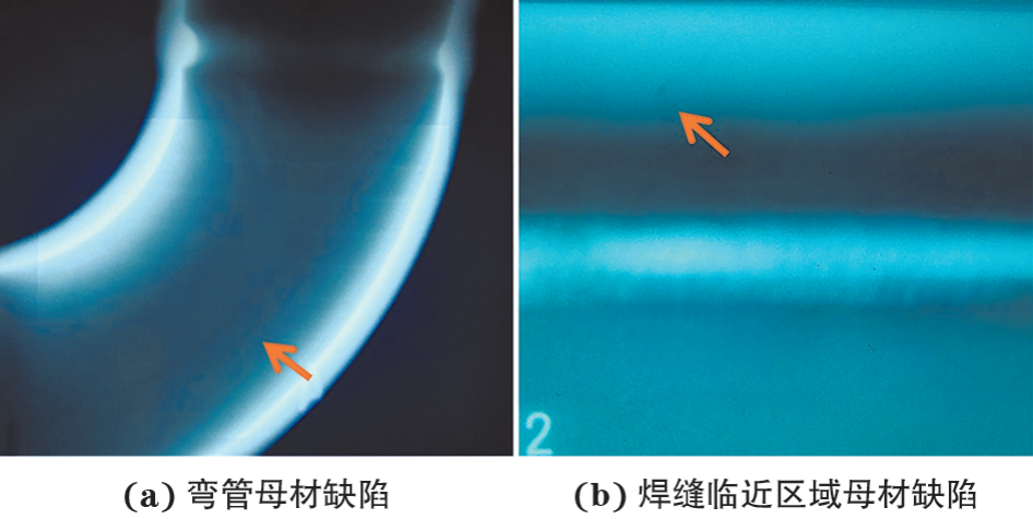 管道或管件通常采用轧制或铸造成形工艺制成,在制造过程中一般采用表面检测和超声检测进行质量控制。为了保证管道焊缝检测区域的全覆盖,在射线检测过程中需要延伸至管道或管件母材区域,因此在射线检测底片中通常会出现管道或管件母材缺陷的影像,如图7所示。